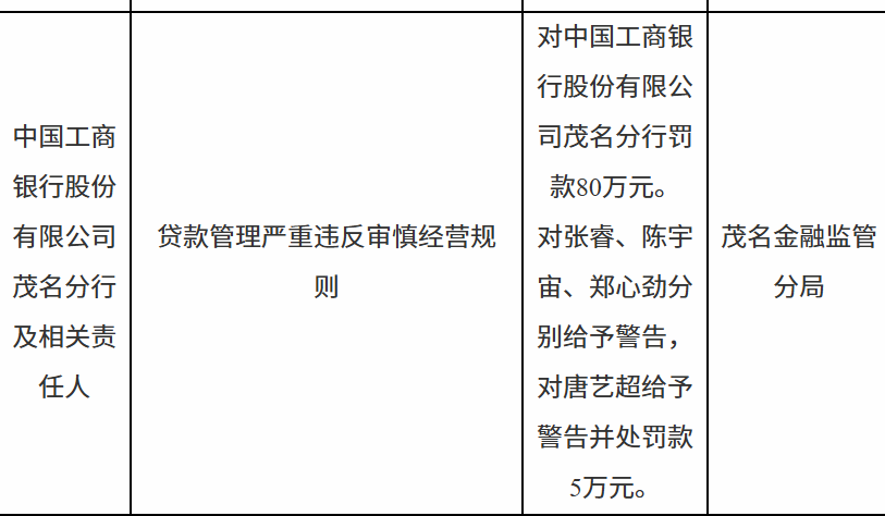 1月5日配资门户网官网,国家金融监督管理总局茂名监管分局行政处罚信息公开表显示,中国工商银行股份有限公司茂名分行及相关责任人因贷款管理严重违反审慎经营规则被罚款80万元。张某、陈某宙、郑某劲分别被给予警告,唐某超被给予警告并处罚款5万元。